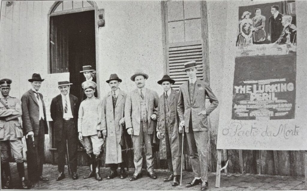 Crentes defronte a um cinema usados para cultos, em local desconhecido, nos anos 20 ou 30.