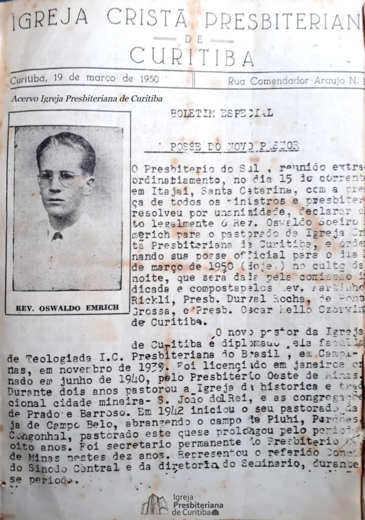 Boletim da IP de Curitiba anunciando a posse do Rev. Oswaldo S. Emrich no pastorado da igreja, em 19.03.1950.